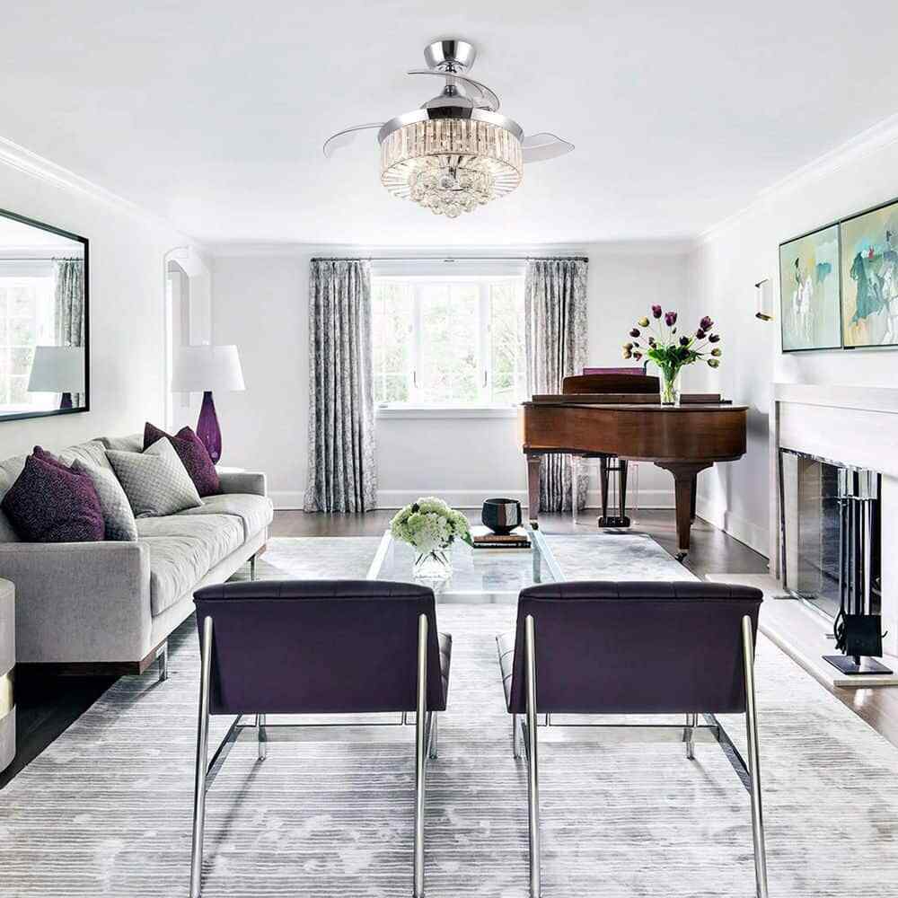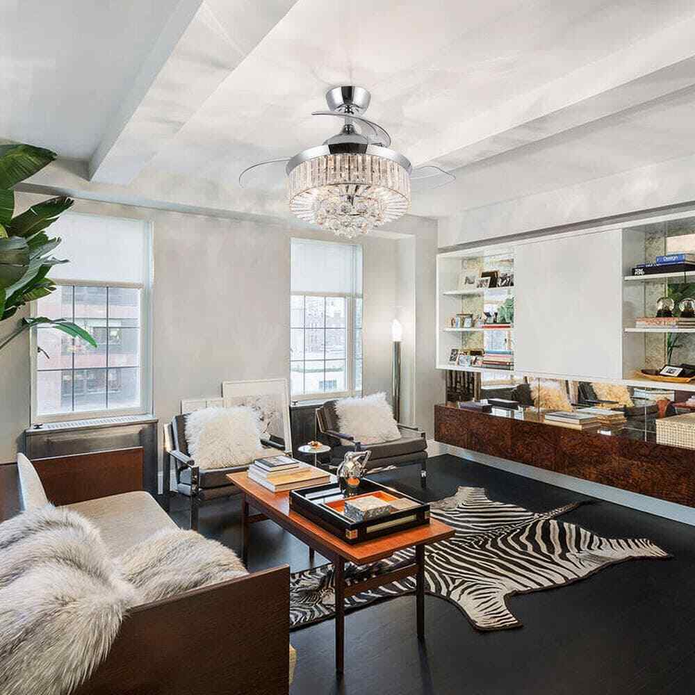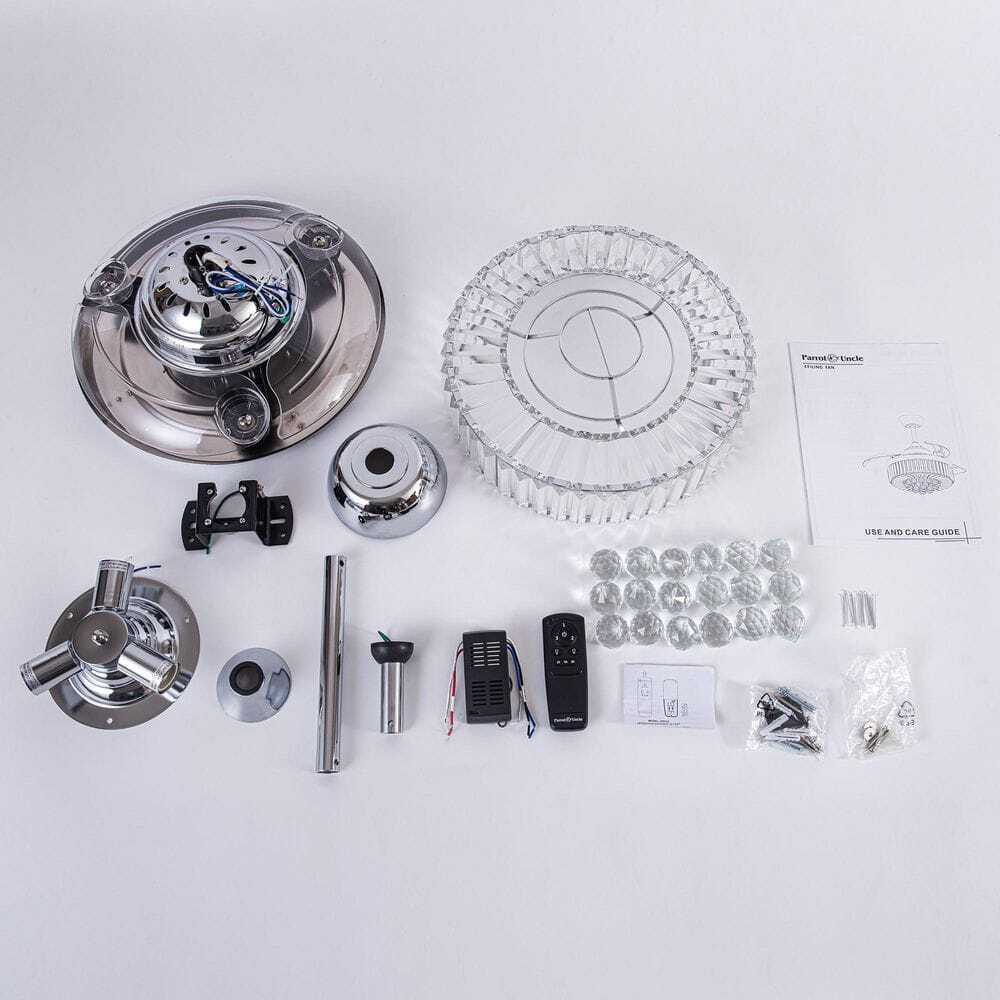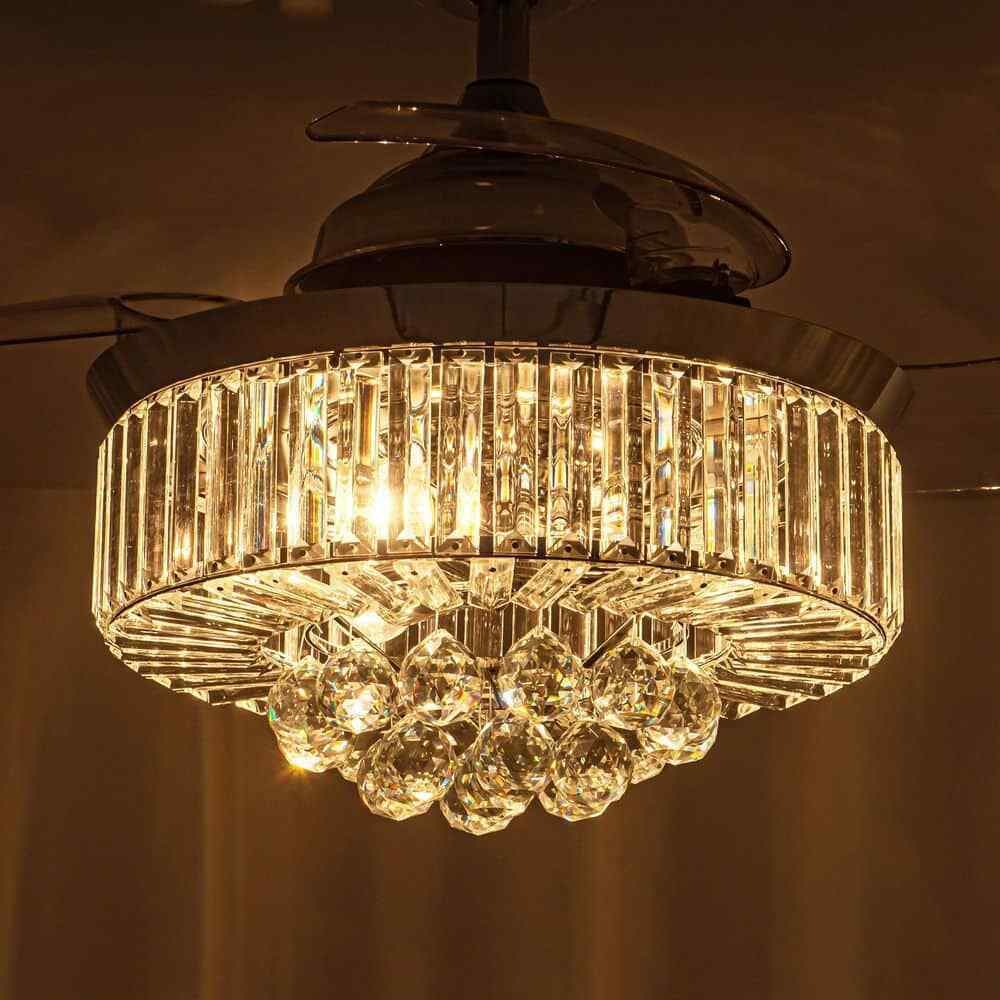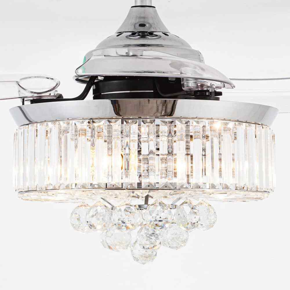 This Broxburne 36-inch chrome modern crystal chandelier ceiling fan features a classic chrome finish fan motor and three clear retractable ABS blades that offer a touch of modernity to the indoor accent. The sparkling shade is made of clear crystal balls and faceted rectangular prisms, which are a dazzling addition to your house space. A new changed remote control is included for independent light on/off and 3-speed adjustments, convenient to use in your living room, bedroom, kitchen, and dining room.- Chrome finish, modern and glam crystal chandelier ceiling fan