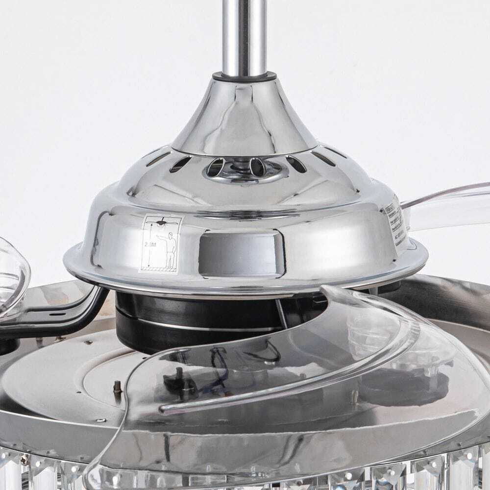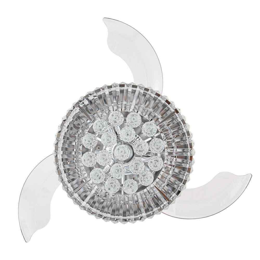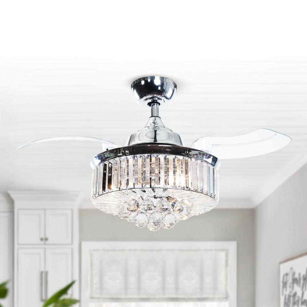 This Broxburne 36-inch chrome modern crystal chandelier ceiling fan features a classic chrome finish fan motor and three clear retractable ABS blades that offer a touch of modernity to the indoor accent. The sparkling shade is made of clear crystal balls and faceted rectangular prisms, which are a dazzling addition to your house space. A new changed remote control is included for independent light on/off and 3-speed adjustments, convenient to use in your living room, bedroom, kitchen, and dining room.- Chrome finish, modern and glam crystal chandelier ceiling fan