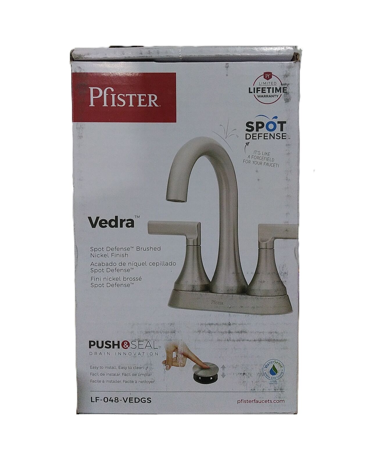 Add graceful simplicity to the bath with Vedra. The transitional modern style of this collection is versatile to match with any decor. The fluid and elegant movement in the design not only provides comfort during use but will add an undeniable warmth to your home.- Centerset Bathroom Faucet: Features two handles and a spout on a single mount to fit 3-hole sinks; great when sink space is limited; includes valve and cartridge
