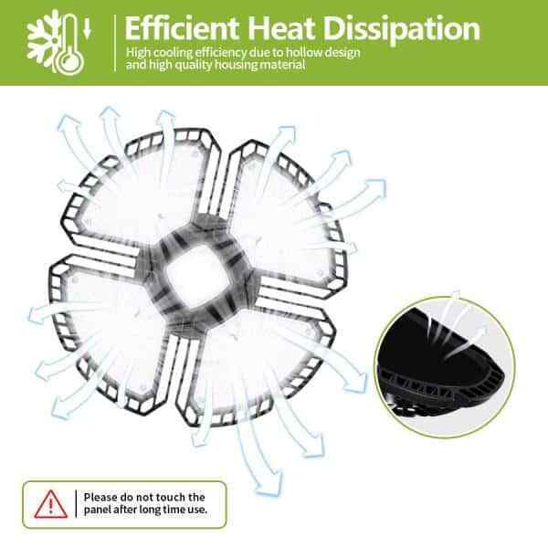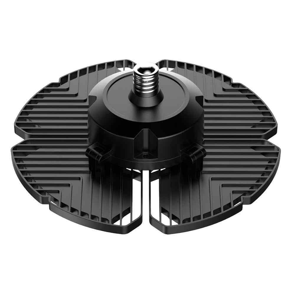 Pinegreen Lighting Deformable LED Garage Light Bulb uses advanced SMD LED chips, generates 15,000 Lumens of brightness using only 100-Watt, saving you about 85% less energy than the traditional incadescent equivalent. The 4 adjustable light heads allow you to modify the illumination at your will. You can either fold the panels flat for focused downlighting, or tilt them up for area lighting. The sturdy construction and die-cast aluminum heat sink design ensures good heat dissipation and long lifespan (up to 50,000 hours). This light is great for garages, workspaces, attics or any space that needs extra light.- Super Bright: 15,000 Lumens high brightness, 5000K white daylight, ideal for both indoor and protected outdoor fixtures