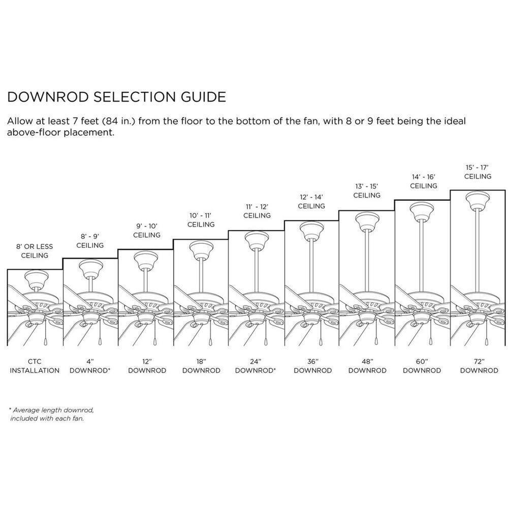 - Dimensions: measures 52 in. Dia x 13.5 in. H, a 1 in. x 4-1/2 in. downrod is included, longer accessory downrods can be ordered separately