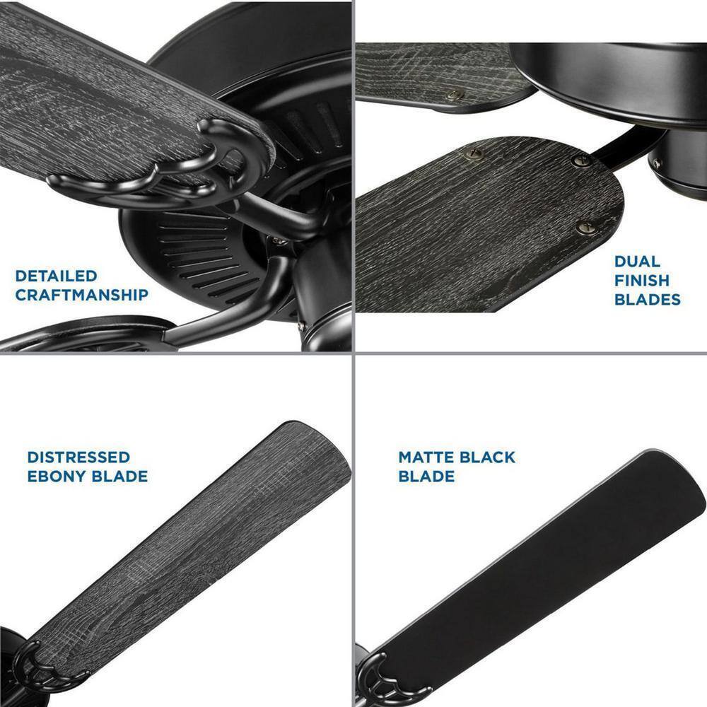 Enjoy the beautiful expansive design of the ENERGY STAR rated Air Pro Collection 52 in. 5-Blade Matte Black/Distressed Ebony AC Motor Traditional Ceiling Fan ideal for any great room, bedroom, living room or bonus room. Perfect for traditional and transitional style settings. 5 reversible blades are coated in matte black and distressed ebony finishes for extra design versatility. Measures 52 in. Dia x 13.5 in. H. A 1 in. x 4-1/2 in. downrod is included. Longer accessory downrods can be ordered separately. 3-speed pull chain control, manual reverse switch and universal light kit compatible. Dual mount canopy that accommodates flat or sloped ceilings (sloped minus 30°). Light kit adaptable with universal light kit. Experience energy-efficient savings with the fan's cutting-edge AC motor. Certifications: ENERGY STAR Certified, Title 20, UL and Dry Location Listed. Pairs with a variety of Progress Lighting fixtures. It's time to breathe new life into the mundane every day with timeless and truly transformative lighting. Make your purchase today to begin your journey to a whole new lighting experience. Progress Lighting products are designed for exceptional quality, reliability and functionality.- Application: ideal for any great room, bedroom, living room or bonus room