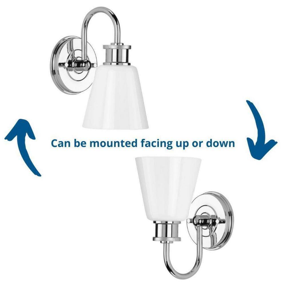 Provide nostalgic charm with the Ashford Collection 1-Light Polished Chrome Opal Glass Farmhouse Bath Vanity Light. The circular backplate, elegantly curved arm and vintage light bases are coated in a beautiful polished chrome finish for a crisp aesthetic. A light source glows from inside an opal glass shade that skillfully blends the old with the new. for ideal illumination, use 1 medium base bulb that is sold separately (100-Watt maximum - LED/CFL/incandescent). The wall light is compatible with dimmable bulbs. The bath light's crisp design is ideal for any entryway, hallway, foyer, bedroom, sitting room, living room or bathroom in farmhouse, coastal and transitional style settings. It's time to breathe new life into the mundane every day with timeless and truly transformative lighting. Make your purchase today to begin your journey to a whole new lighting experience. Progress Lighting products are designed for exceptional quality, reliability and functionality.- Provide nostalgic charm with the Ashford collection 1-light polished chrome farmhouse bath vanity light ideal for any entryway, hallway, foyer, bedroom, sitting room, living room or bathroom