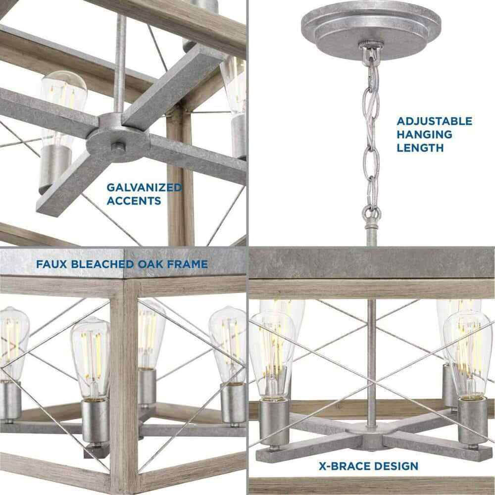 Create a rustic atmosphere with a chandelier from the Briarwood Collection. Light sources exude a comforting country glow through the X-brace design reminiscent of country barn doors and rustic farmhouse gates. The faux wood frame is coated in a bleached oak finish complemented by galvanized accents. Compatible with dimmable bulbs.- Ideal for a dining room