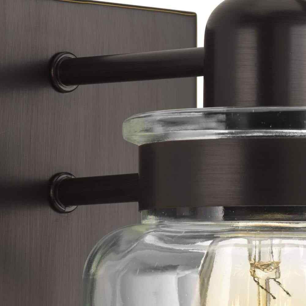 Manifest an atmosphere of positive energy by updating your bathroom decor with the vintage-inspired Calhoun Collection Antique Bronze Two-Light Farmhouse Wall Light. Relish in the warm glow created by this one-of-a-kind fixture that boasts a living treasure of well-crafted features that feel both polished and personal. Stunning thick glass shades with a classic handmade appearance are held in place by mechanical latches reminiscent of antique spice jars, creating a gaze-grabbing apothecary vibe. A sleek rectangular backplate covered in a beautiful antique bronze finish continues the classic attitude of the must-have design. Round polished arms extend from the backplate to hold the light sources in their distinguished places. This statement light fixture is a must-have for illuminating any bath and vanity setting in mid-century modern, urban industrial, vintage electric, transitional, and farmhouse interiors. Mount the bath bracket facing up or down, around or over a bathroom mirror to banish shadows from your face while getting ready for the day or an evening out. It's time to breathe new life into the mundane every day with timeless and truly transformative lighting. Make your purchase today to begin your journey to a whole new lighting experience. Progress Lighting products are designed for exceptional quality, reliability, and functionality.