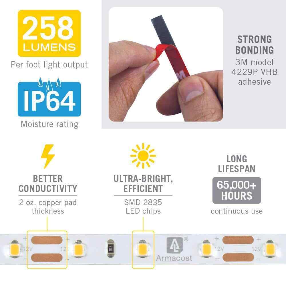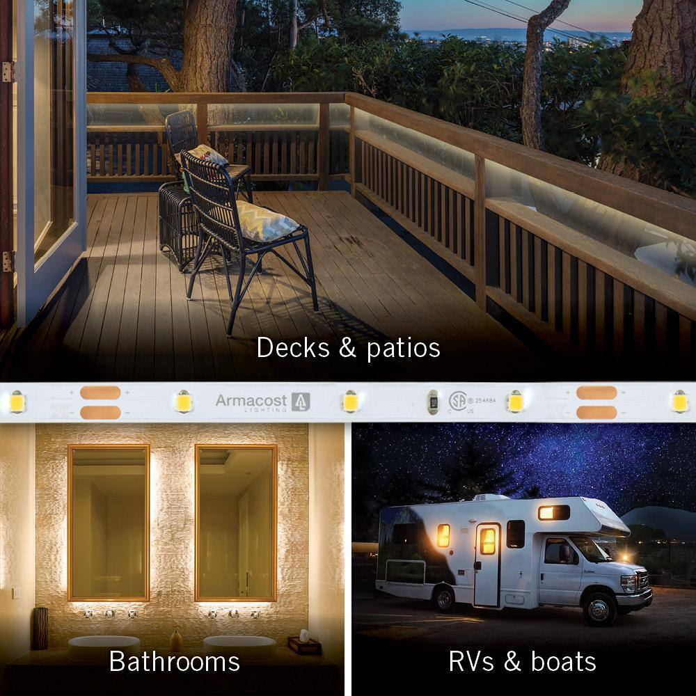 Armacost Lighting's RibbonFlex Pro Outdoor LED Tape Light is the perfect LED light strip for low-voltage, energy-efficient accent lighting projects. These LED strip lights are designed to meet the layout and installation requirements of lighting professionals and feature high quality, professional-grade components that are longer lasting and create a premium look. 12V strip lights are easy-to-install and feature 3M adhesive backing for a permanent hold. LED light tape is ideal for many applications including under cabinet lighting, tray ceiling lighting, toe kicks, RVs, boats, motor homes and commercial spaces. RibbonFlex Pro Outdoor LED Tape Light is part of Armacost Lighting's premium-quality component-based system, designed for custom installations. The strip light is rated up to IP64, meaning it can be used in wet locations, but is not submersible.- Professional quality LED strip lights: With industry leading lifespan and higher lumens output, this is the perfect LED solution for architectural LED lighting, under cabinet lighting, tray ceiling lighting, toe kicks, RVs, boats, motor homes and commercial lighting projects