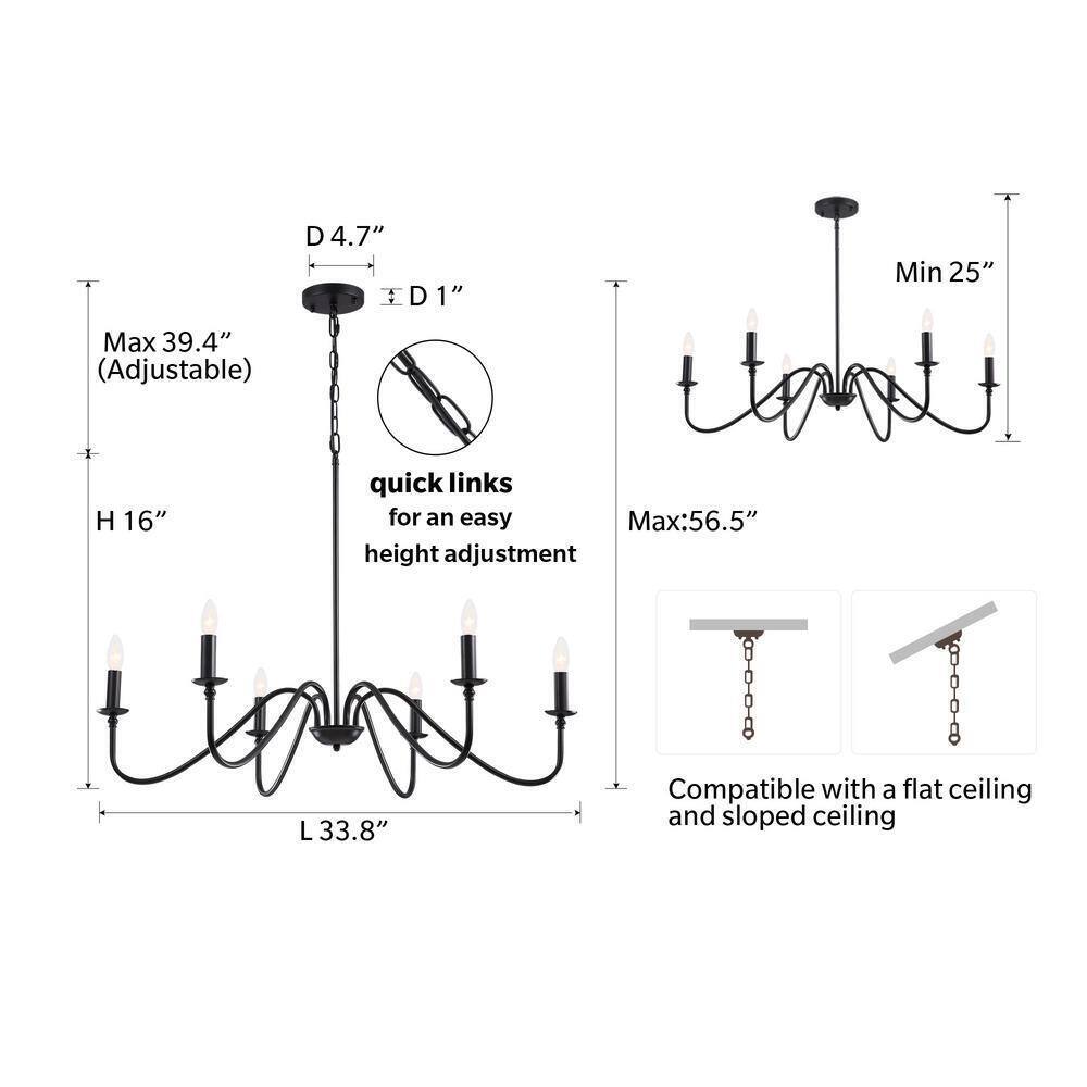 This modern farmhouse candelabra chandelier features 6 elegant arms and a sleek matte black finish, creating a simple yet charming and sophisticated atmosphere. With its adjustable design, this black chandelier is versatile and can be used in a variety of spaces, including hallways, living room, dining rooms and foyers. It adds a touch of elegance to any room. The classic chandelier has dimensions of 34 in. W and 16.14 in. H, with a chain length of 39.37 in. For your convenience, this rustic chandelier is fully dimmable when used with a compatible dimmer switch and dimmable bulbs dimmer switch and bulbs not included. This allows you to create the perfect ambiance and adjust the lighting to your desired level of comfort. Installation of this chandelier light fixture is a breeze. It comes with all the necessary hardware and the chandelier is pre-wired and pre-threaded for easy assembly. Once installed, you can immediately enjoy the beautiful lighting it provides.- Farmhouse black finished wrought iron chandelier: creates a striking and timeless look