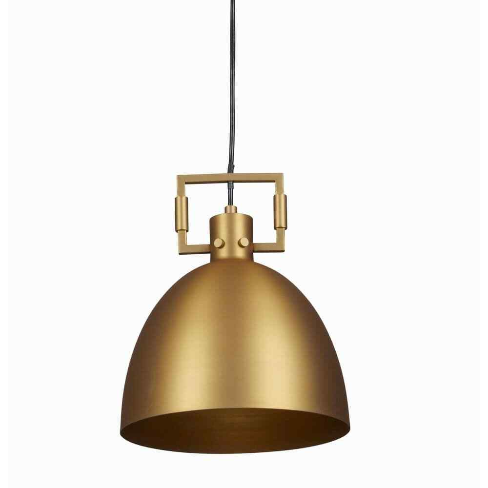The Luka 1-light antique brass pendant by Stanford Lighting features a soft industrial look blending heritage and modernity. The classic dome shade is adorned with a sleek geometric metal detail at the top of the fixture . The fixture is made of metal and is ideal for any kitchen space, powder room, game room, bar, or bedroom.- Modern 1 light pendant in antique brass finish with black cord