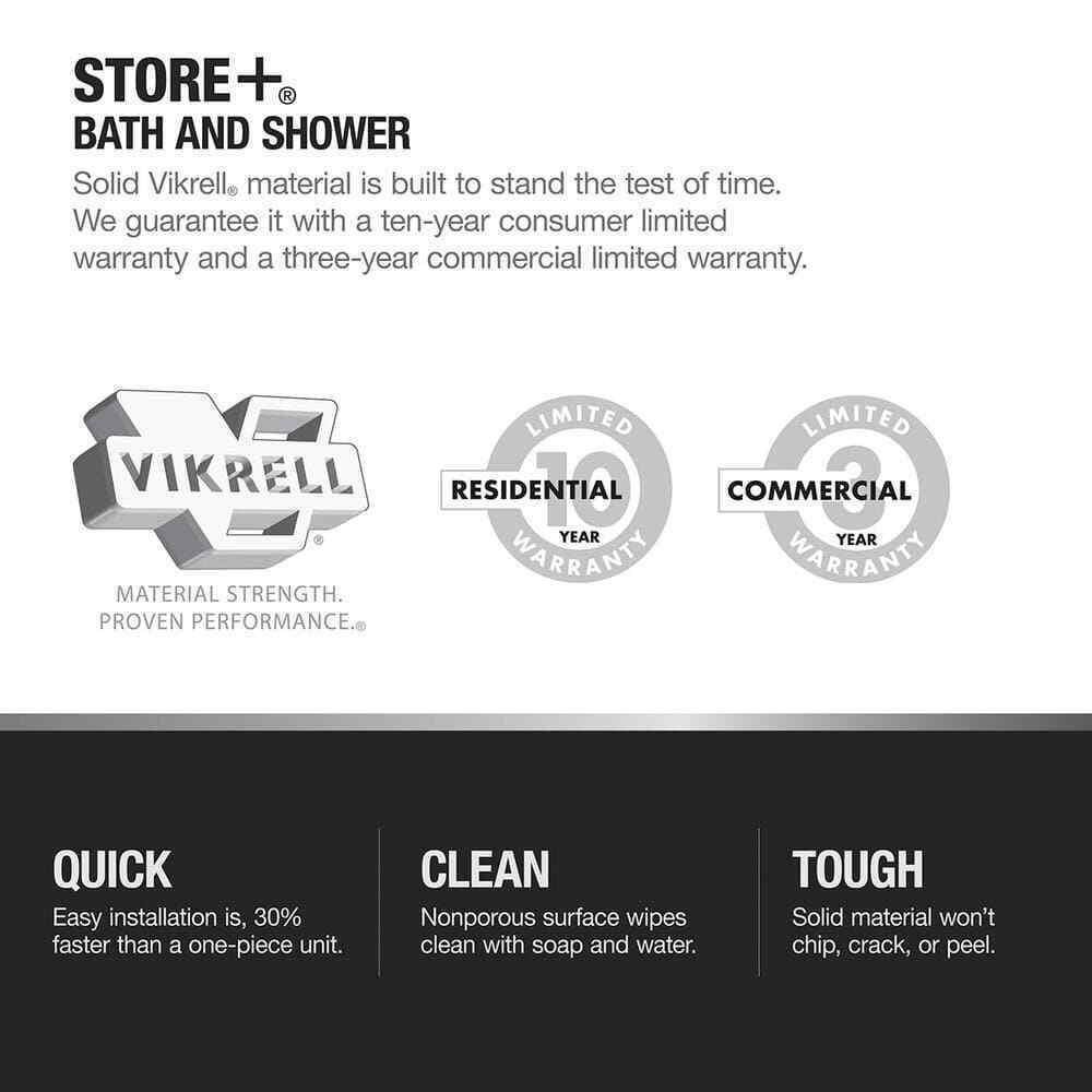 STORE+ is a fully customizable storage bath or shower system with interchangeable accessories to eliminate clutter and organize your shower to fit your needs. Interchangeable corner accessories maximize your showering space. Dishwasher safe shelves and bins.- STORE+ accessory kits meet your storage and organizational needs