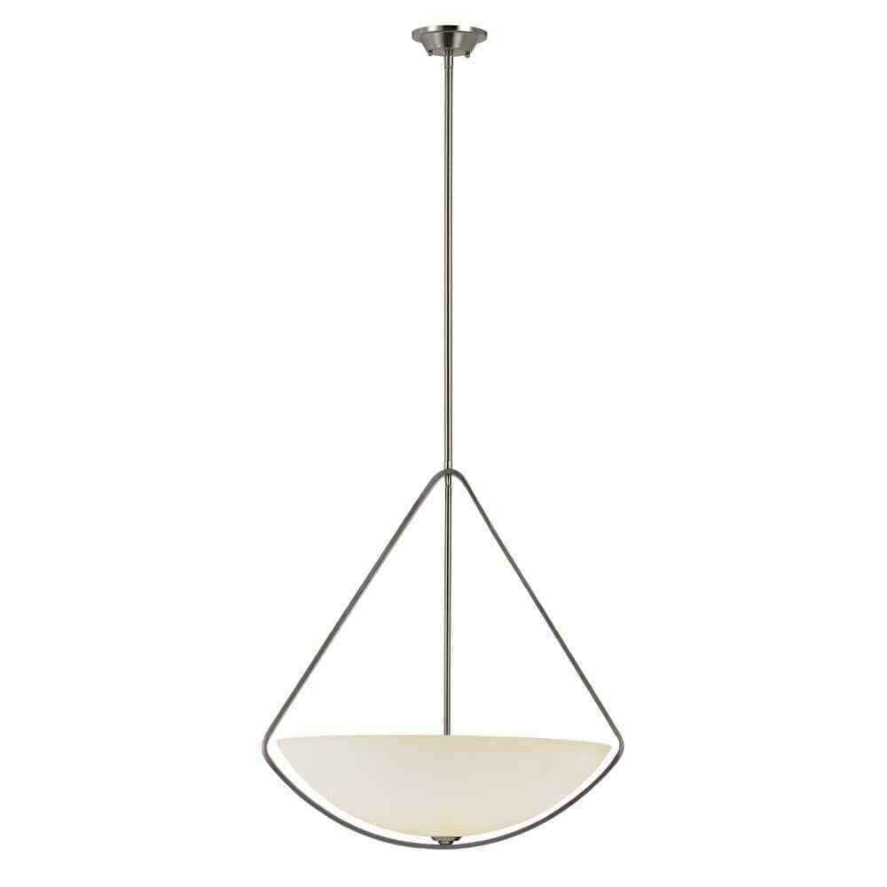 This transitional pendant from Transglobe lighting is a decorative hanging light that works well in dining areas, kitchens, and foyer entrances. Use as a single unit over a dining room table, or install as a set over a linear kitchen island or bar table for additional illumination in larger spaces. The fixture is constructed of brushed nickel finished-metal and includes a circular ceiling plate and a delicately curved support structure to hold the glass shade in place. The frosted glass shade features a tapered bowl shape, houses four light bulbs, and is open at the top for easy access to change the bulbs. The pendant body hangs from extension rods, of which multiple extra rods are included for an adjustable height. The simple style and neutral colors support modern, contemporary, and traditional interior decor styles.- Brushed nickel finish metal frame