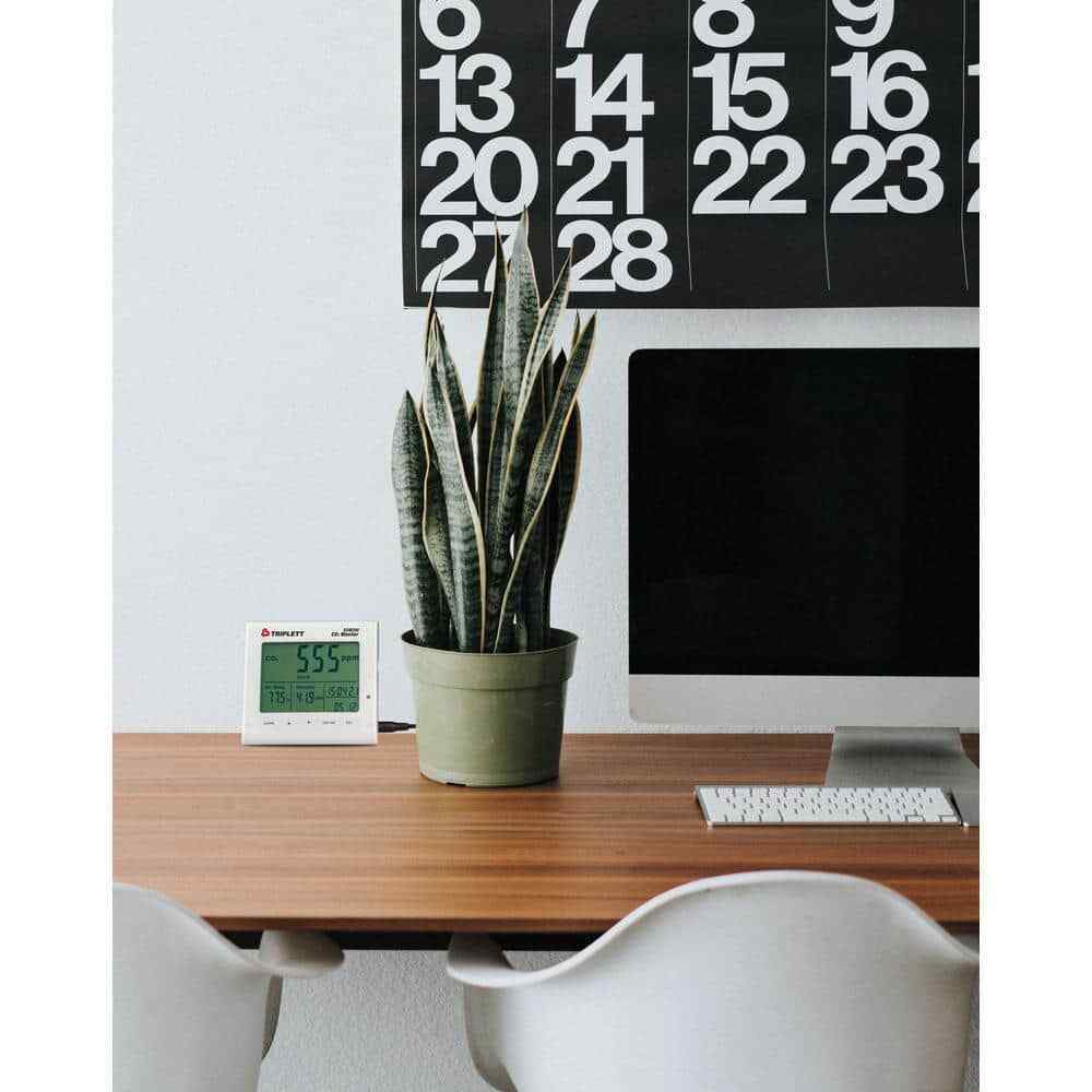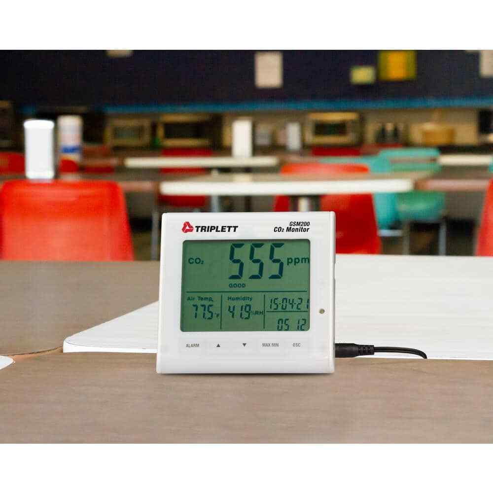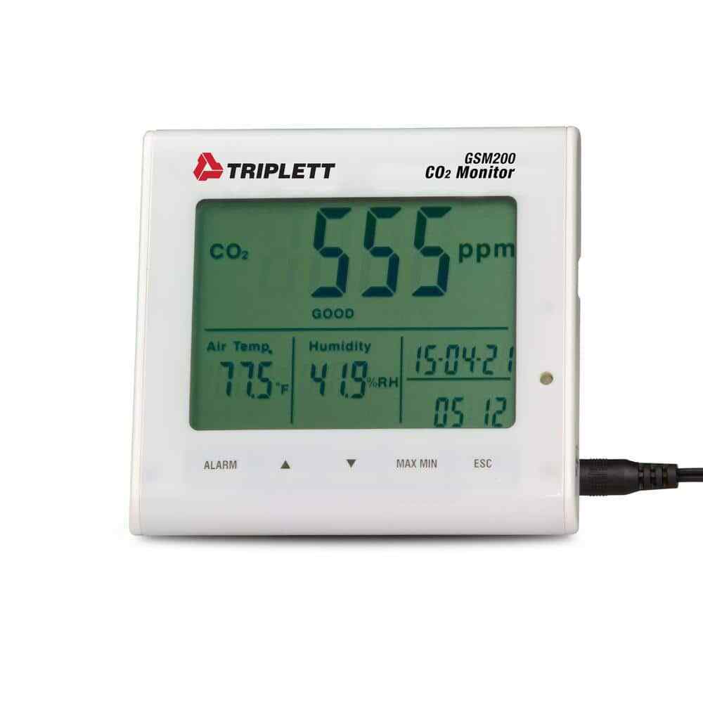 The Triplett Model GSM200 Desktop Indoor Air Quality CO2 Monitor simultaneously displays CO2, Temperature, Relative Humidity, Time and Date and can be used to measure air quality in office buildings, schools, exhibition halls, shopping malls, meeting rooms, fitness centers, restaurants and other public places. It has 3 status indicators (Good/Normal/Poor) that change with CO2 concentration and user programmable audible/visual CO2 alarms (Good (default 800ppm), Poor (default 1200ppm)) with disable to alert you when safe CO2 levels have been exceeded. The sensor incorporates NDIR (non-dispersive infrared) waveguide technology and has a built-in CO2 Automatic baseline calibration for long term drift compensation. Minimum/Maximum function records the highest and lowest readings for CO2, Temperature and Humidity over time and Data Hold can freeze the reading on the display for easy viewing. Temperature readings are °F/°C selectable. Includes AC adapter.- Simultaneously displays CO2, temperature, relative humidity, time and date