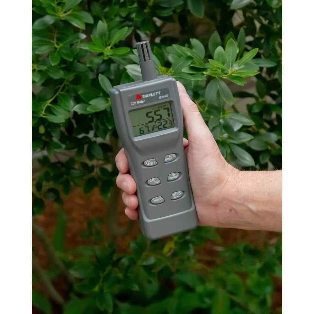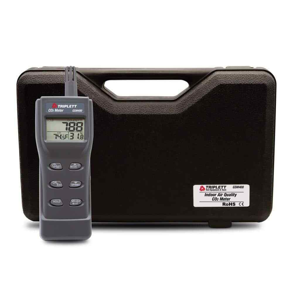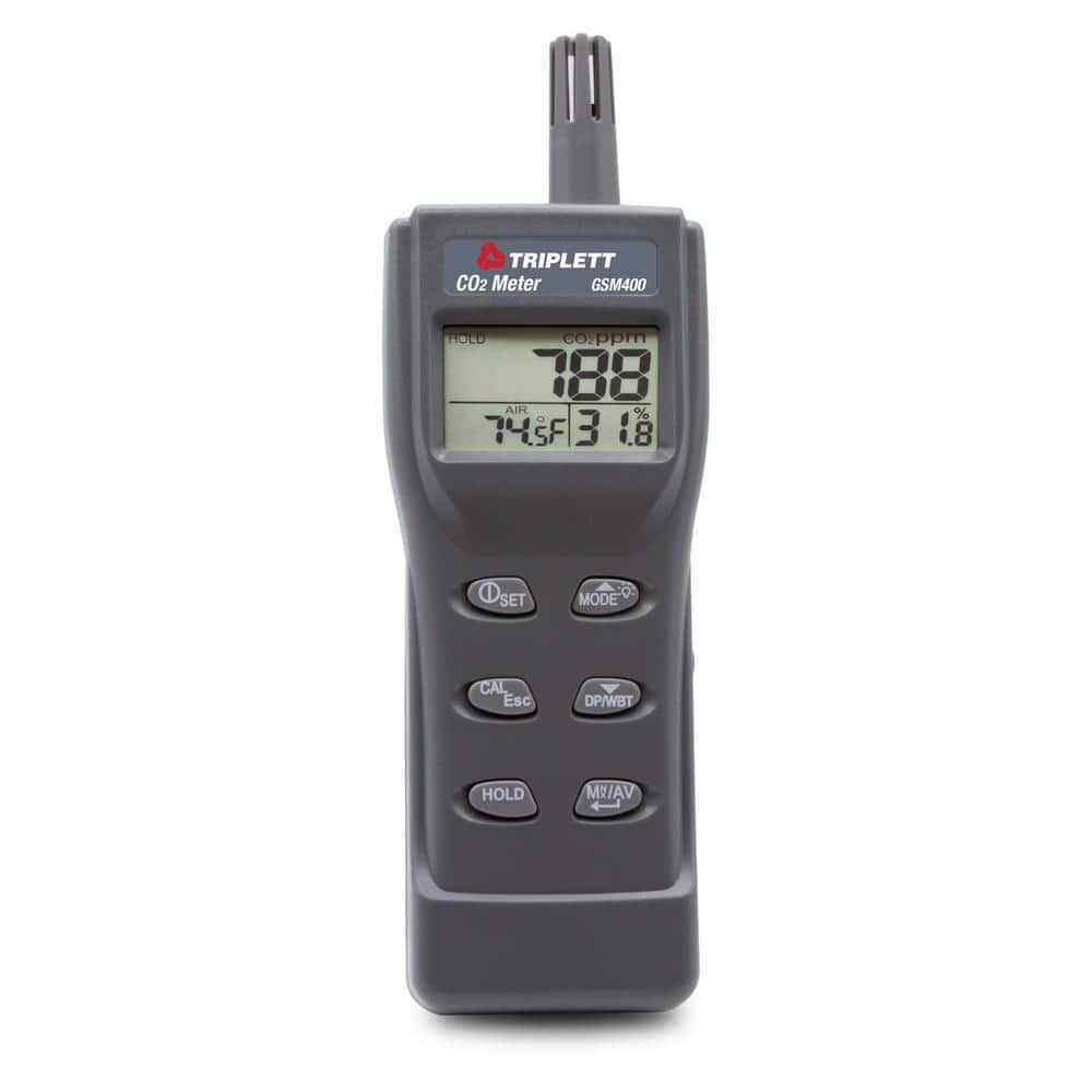 The Triplett Model GSM400 Indoor Air Quality CO2 Meter measures CO2, Temperature, Humidity, Wet Bulb and Dew Point and can be used to measure air quality in office buildings, schools, exhibition halls, shopping malls, meeting rooms, fitness centers, restaurants and other public places. The meter incorporates NDIR (non-dispersive infrared) waveguide technology and simultaneously displays CO2, Temperature and Relative Humidity on its backlit triple LCD display. It features TWA (Time Weighted Average - 8 hours) and STEL (Short Term Exposure Limit minu 15-minute weighted average) measurement with a user-adjustable CO2 alarm level. Additional features include Minimum/Maximum to record the highest and lowest readings, Data Hold freezes the reading on the display, and Auto power off with disable to conserve battery life. °F/°C selectable. Includes 4 AA batteries and carrying case.- Measures CO2, temperature, humidity, wet bulb and dew point