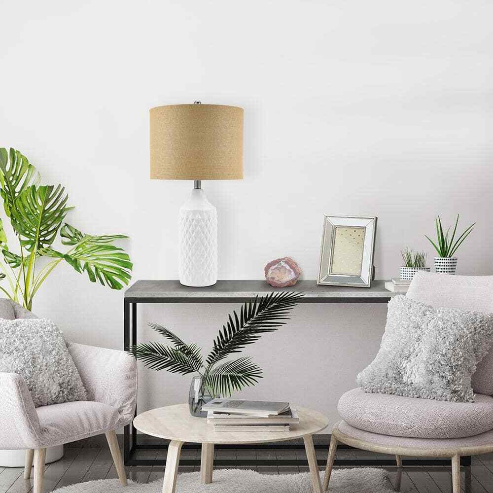 Bring that coastal beach feeling to your favorite room with this modern table lamp. It's white brings a minimal and crisp feeling to your living room, bedroom, or home office. It's unique quilted texture upgrades it to being more than just a simple table lamp, while giving a warm glow with the help of it's burlap shade.- Fashionable, quilted white ceramic body