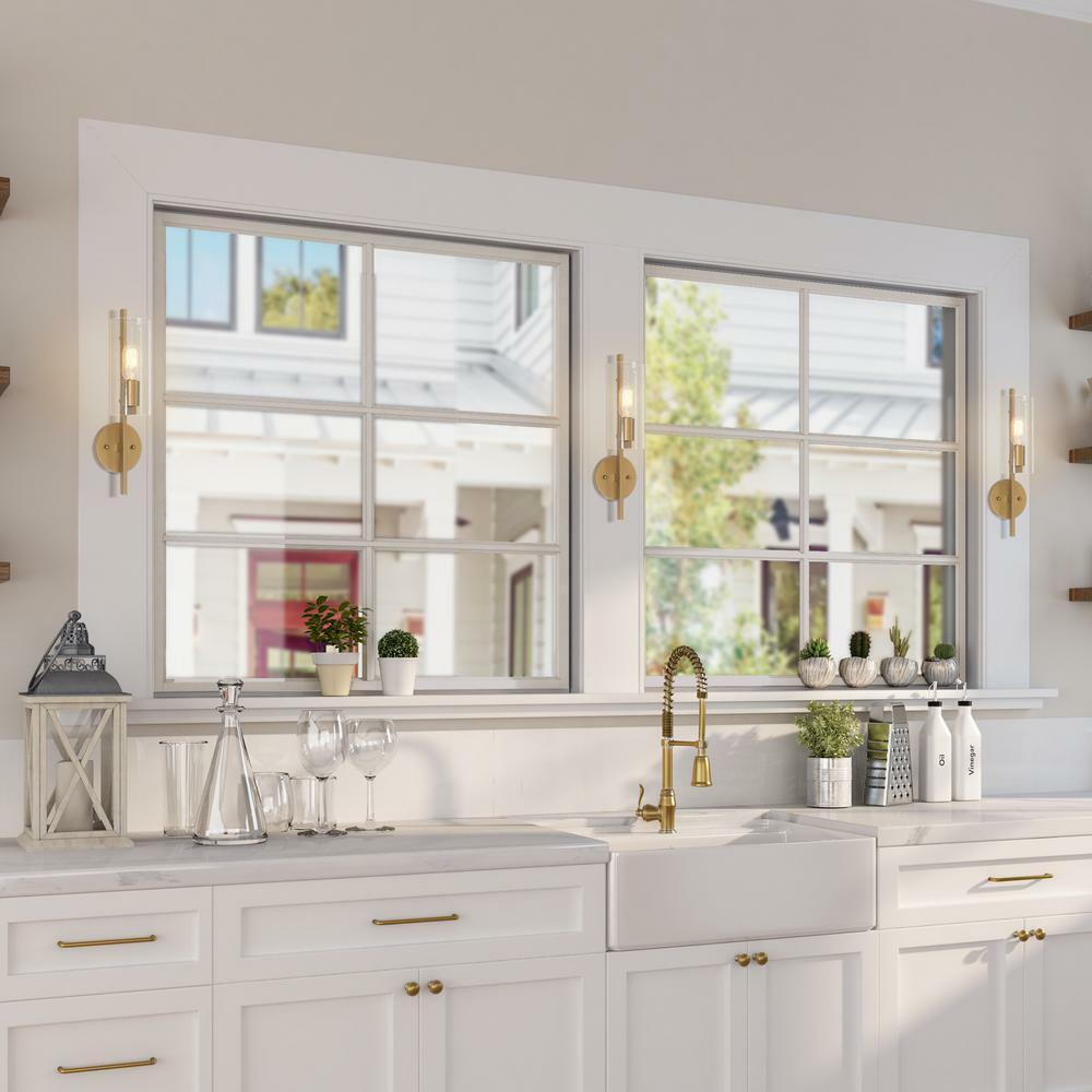Incorporate urban modern style into your living space with this uniquely elegant 1-Light Brass Gold Wall Sconce Bathroom Vanity Light by Uofin Lighting, safely rated for damp locations. This sconce has a chic minimalist body with a round metal backplate and clear, cylindrical, seeded glass shade that lets the light shine through to illuminate your space. Whether you are searching for an event or retail lighting for a business space, or want to refresh your home's hallway, bathroom vanity, powder room, bedroom, or living room, this transitional light fixture will help you distinguish your style.- MODERN WALL SCONCE: Marring modern and industrial elements, this transitional light fixture is coated in a brass gold finish, featuring a round metal backplate and clear, cylindrical, seeded glass shade for a minimalist contemporary feel