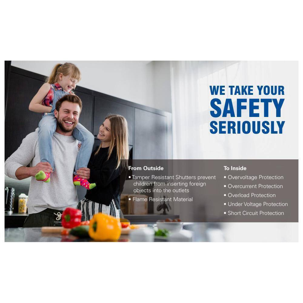 - Tamper resistant shutters - prevent children from inserting any unwanted objects into the outlets