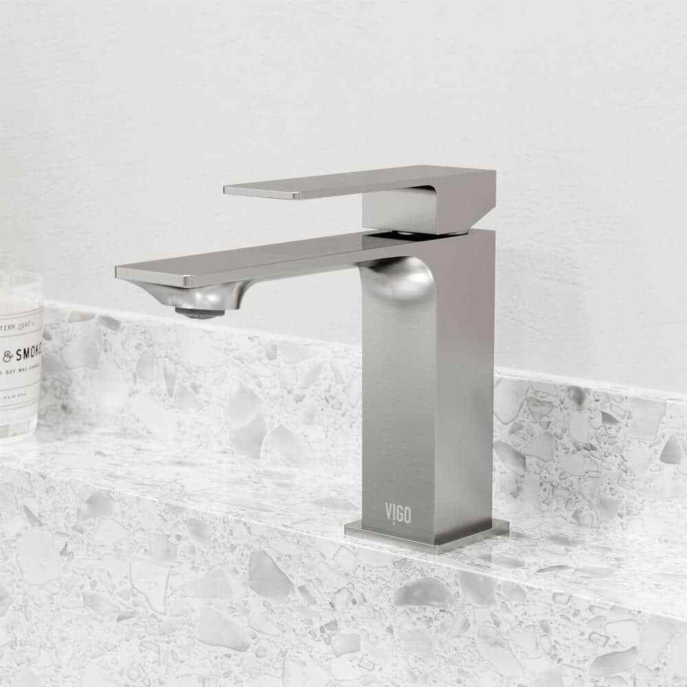 Bring an aesthetic upgrade onto your bathroom interior design with the Dunn single-hole, single-handle bathroom faucet by VIGO. Its handle grants effortless control over the faucet, releasing a soothing stream of water directly into the sink. The rectangular high spout provides plenty of space for a comfortable hand-washing experience. VIGO's premium 7-layered hardware finish resists tarnishing and grants lasting durability to the faucet. Give your bathroom a touch of everyday luxury with the Dunn brushed nickel faucet by VIGO.- All parts, hardware, and user-friendly instructions support easy DIY installation within minutes