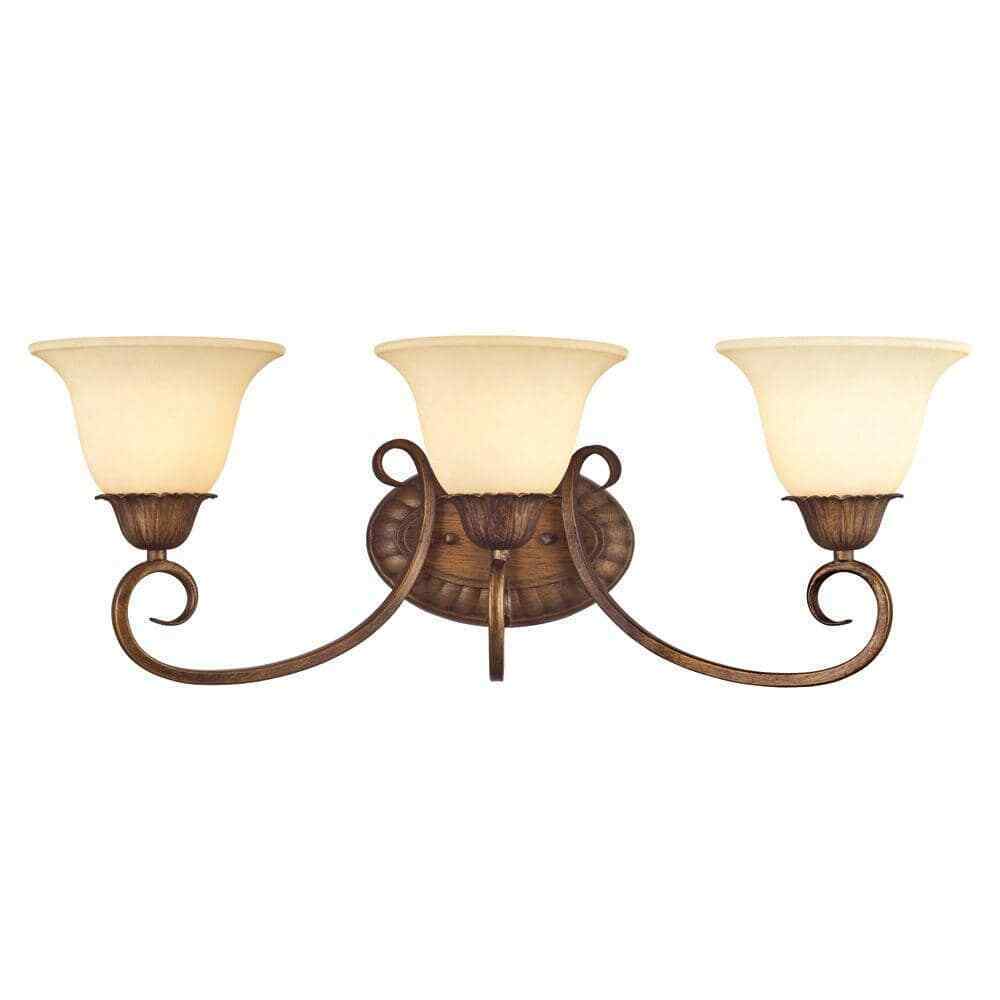 Enrich your home decor with the classic appeal of this Regal Springs wall light. Elegantly designed with burnt Scavo glass shades upon gracefully scrolled arms, this 3-light fixture will refresh any room with its generous, soft glow. It features an oval back plate with a ribbed design, making it the perfect lighting option for traditional living rooms, kitchens and dining areas. This light is made with an enchanting ebony gold finish and mounts up or down for versatility. Bulbs not included.- Three-light design provides ample illumination